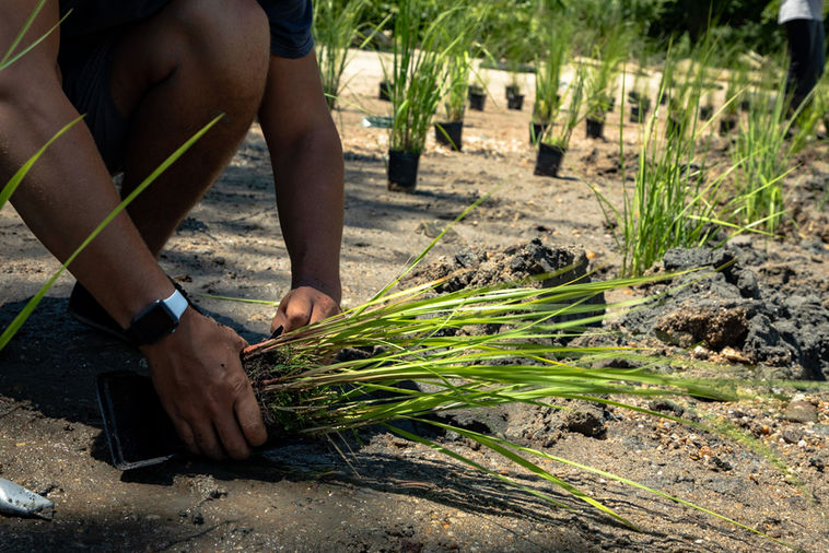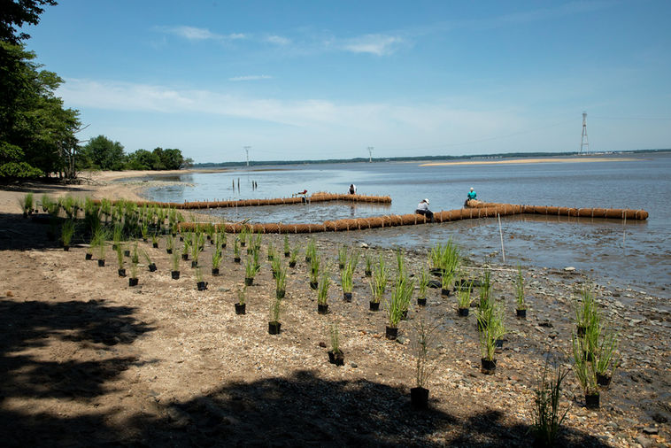 University of Delaware graduate students alongside Dr. Jack Puelo installed a "living shoreline" along one part of Pea Patch Island's beach. This project required expertise in land management, civil/environmental engineering as well as landscape architecture. The goal of the project is to adequately analyze if living shorelines such as these will be a viable and more eco-friendly alternative to minimizing erosion along wake heavy coastal areas in the Delaware Bay.