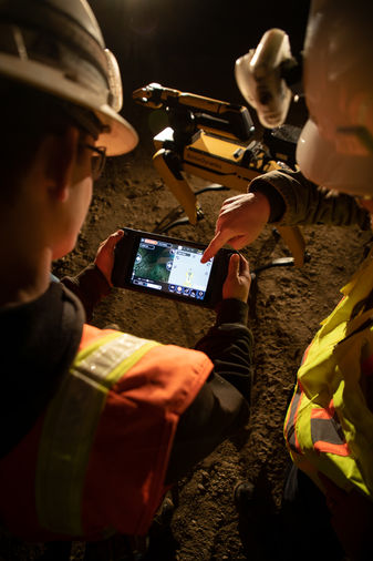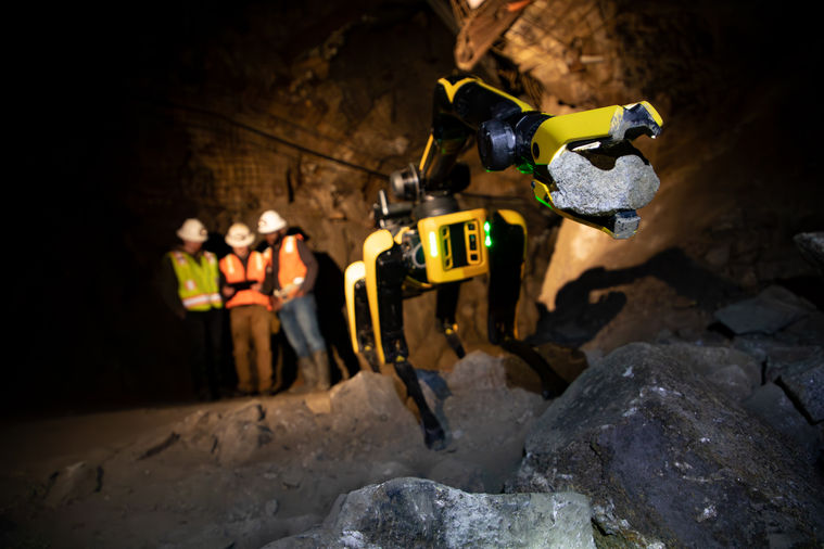 Mining and Geology students at Montana Tech test out the Mining Engineering department's new Spot Robot Dog. These photos were featured in the Montana Tech's alumni magazine for a story highlighting the graduate school research being conducted in the UMEC(Underground Mining Education Center) under the campus.